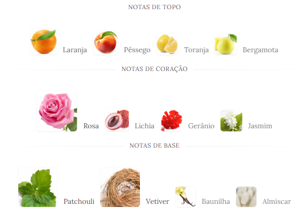 A base é envolvente e marcante, formada por Patchouli, Almíscar, Baunilha e Vetiver, que criam um rastro sofisticado e duradouro na pele. O resultado é uma assinatura olfativa feminina, elegante e intensa, perfeita para quem busca presença e sofisticação em uma fragrância contemporânea.